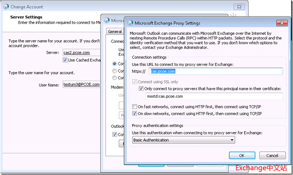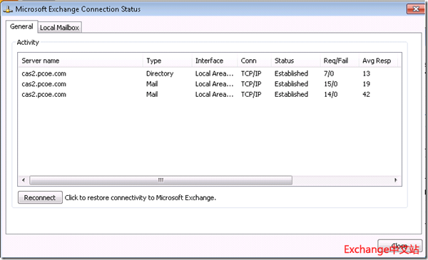 注意:这种情况仅限于2ndSite不面向Internet(None-Internet-Facing)的情况,也就是在ExchAllinOne上没有配置ExternalURL,也没有启用Outlook Anywhere的前提下,客户端才能够自动切换到Outlook Anywhere方式,并且由cas.pcoe.com实现客户端访问的代理。这就是Failover的情况,服务器自动完成切换,客户端自动恢复连接。