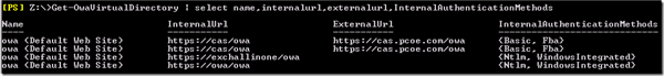 Client Access Server上虚拟目录的配置情况,以OWA为例,其它虚拟目录如OAB/ECP等服务,它们与OWA所使用的主机名完全相同: