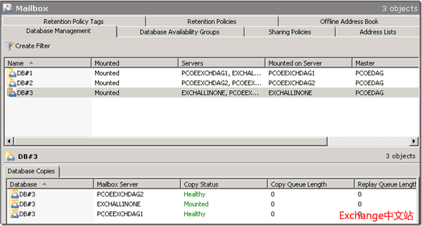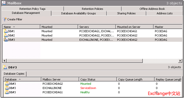 关闭ExchAllinone,数据库DB#3切换到1stSite的PCOEExchDAG2上。