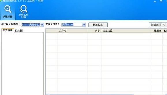 2、准备好后,会弹出“软媒数据恢复”窗口,我们选择目标磁盘为“C”,因为回收站文件是系统盘下的 ,文件名过滤那里你可以选择“所有”(如果你不知道你的是什么格式的话),接下来就可以点击“快速扫描”,他就开始扫描了。