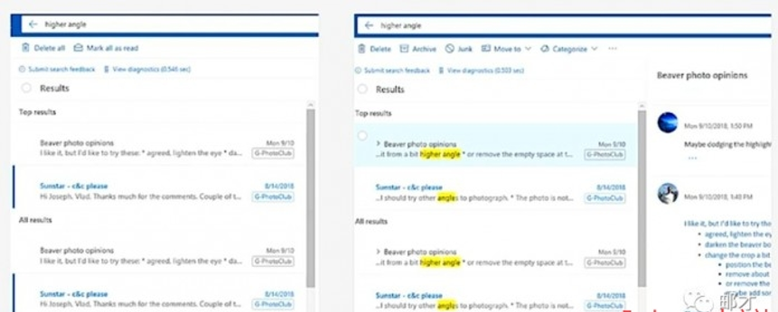 1. 在Exchange 2016之前,根据关键词可以搜到对应邮件,但不会在预览框里高亮显示;在2019里,预览框甚至可