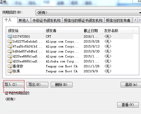 3、在要安装的证书类型时点“受信任的根证书颁发机构”,接下来点左下角的“导入”按钮导入相关的证书即可。